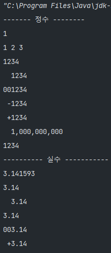 System.out.printf("%-6d%n", 1234); // 1234__ (6자리의 공간을 확보하고 나서 왼쪽 정렬 1234 출력 - 뒤에 두 칸 남음)
