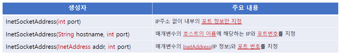 : 하위 클래스인 InetSocketAddress의 생성자로 객체 생성(추상클래스이므로!)