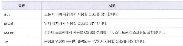 - 미디어 쿼리는 미디어별로 적용할 CSS를 따로 작성하므로 @media 속성 다음에 미디어 유형을 알려줘야 한다.