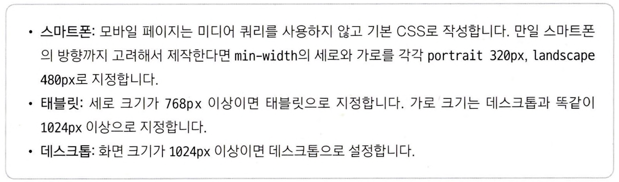 - 미디어 쿼리를 작성할 때 화면 크기에 따라 서로 다른 CSS를 적용할 분기점