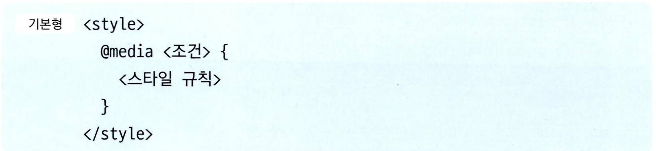 - 첫 번째 방법은 <style> 태그 안에서 media 속성을 사용하여 조건을 지정하고, 그 조건에 맞는 스타일 규칙을 정의하는 것.