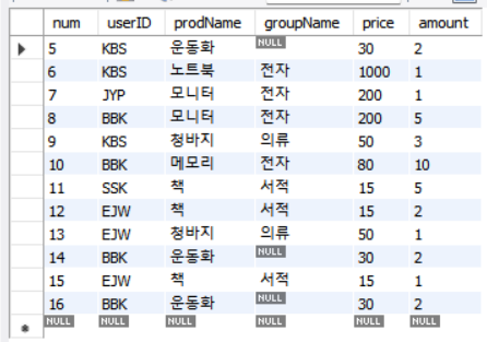 INSERT INTO buytbl VALUES(NULL, 'BBK', '운동화', NULL, 30, 2);
