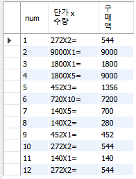 AS '단가 x 수량', price*amount AS '구매액' FROM buytbl;