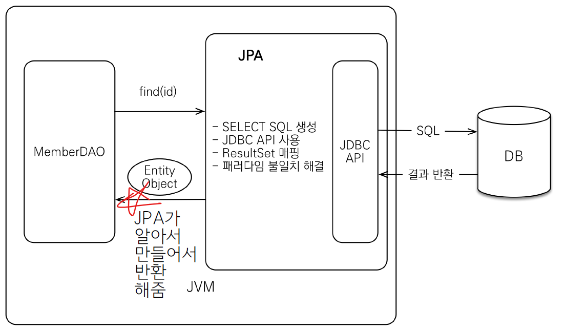 - 원래는 개발자가 직접 해야하는 것을 JPA가 알아서 처리해줌.