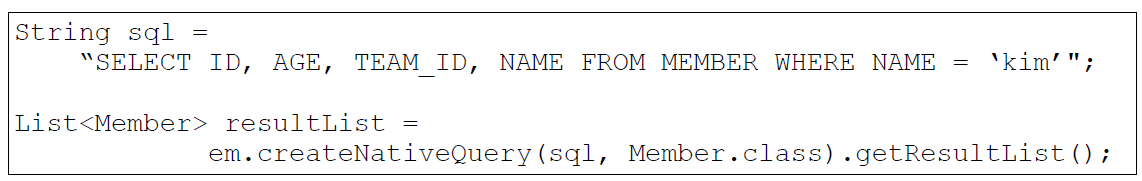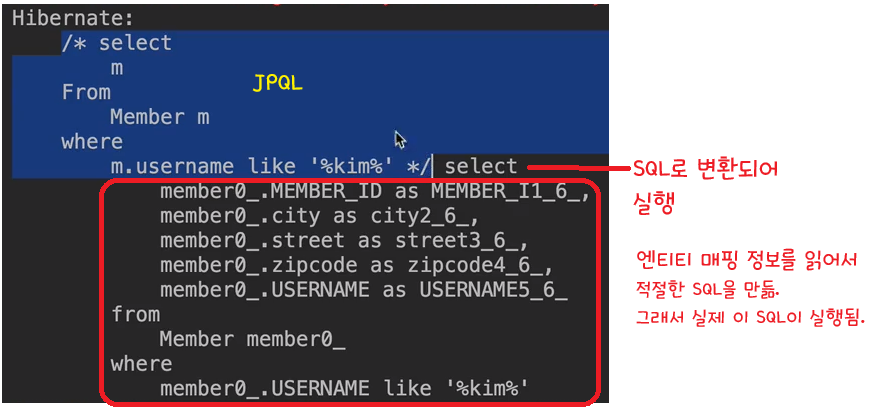 "select m from Member m where m.username like '%kim% '", Member.class)