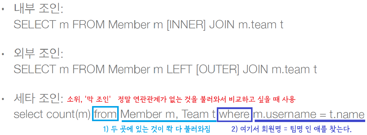 - SQL의 조인과 양상은 비슷하나 얘는 엔티티 중심으로 동작한다.