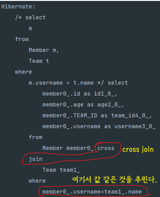 String query = "select m from Member m, Team t where m.username = t.name";