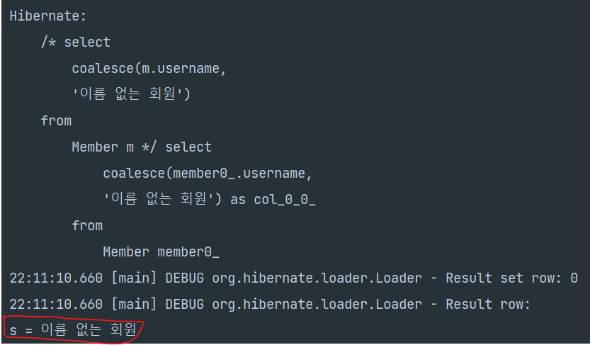 //      String query = "select coalesce(m.username, '이름 없는 회원') from Member m";