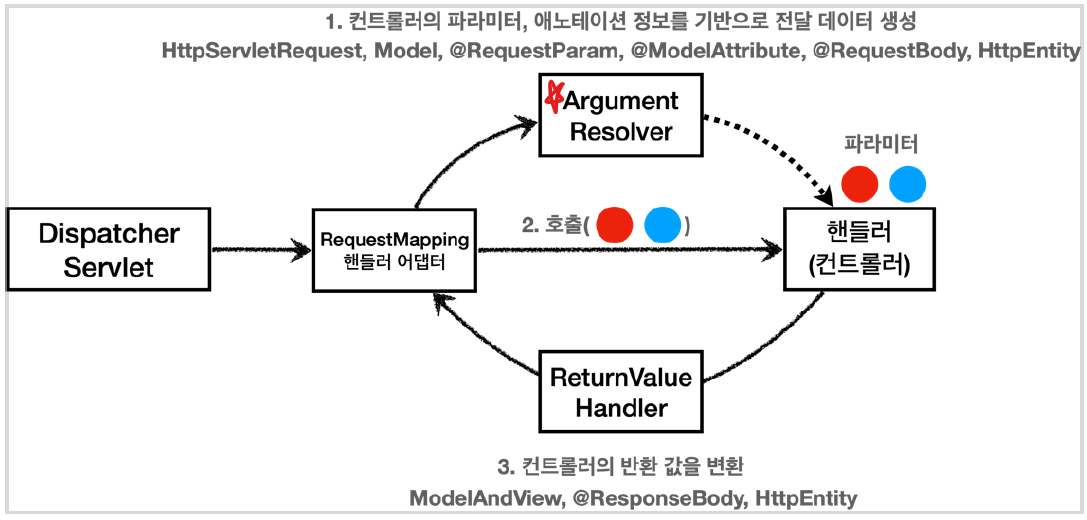 바로 이 ArgumentResolver 를 호출해서 컨트롤러(핸들러)가 필요로 하는 다양한 파라미터의 값(객체)을 생성한다.