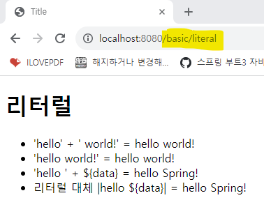 <li>리터럴 대체 |hello ${data}| = <span th:text="|hello ${data}|"></span></li>