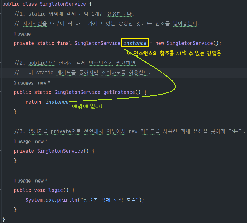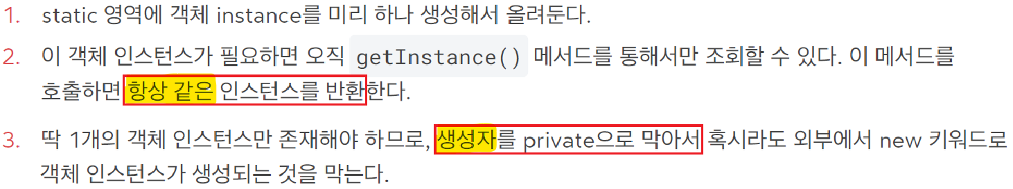 참고: 싱글톤 패턴을 구현하는 방법은 여러가지가 있다. 여기서는 객체를 미리 생성해두는 가장 단순하고 안전한 방법을