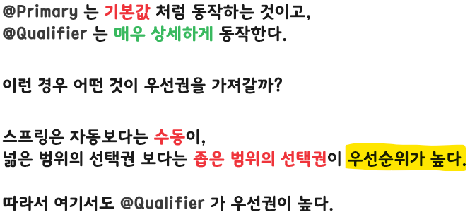 여기까지 보면 @Primary 와 @Qualifier 중에 어떤 것을 사용하면 좋을지 고민이 될 것이다.