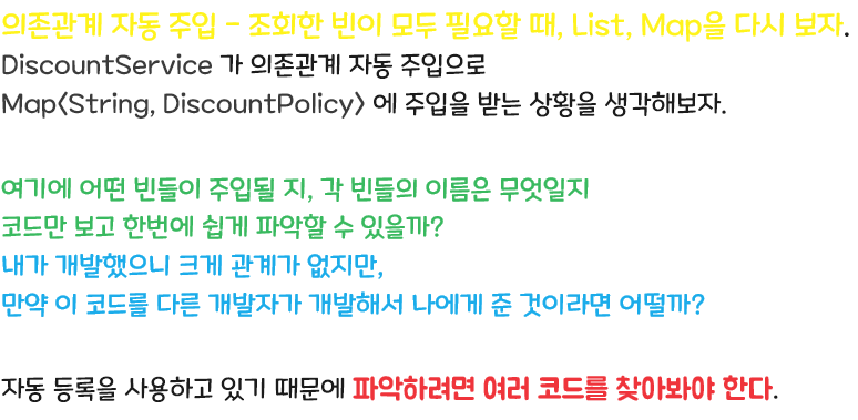 - 그래도 빈 자동 등록을 사용하고 싶으면 파악하기 좋게 DiscountPolicy 의 구현 빈들만 따로 모아서 특정 패키지에