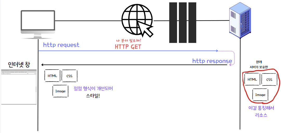 • 서버는 서버에 위치한 리소스를 찾아서 response를 보내준다. 그러면 클라이언트는 HTML을 수신한다.