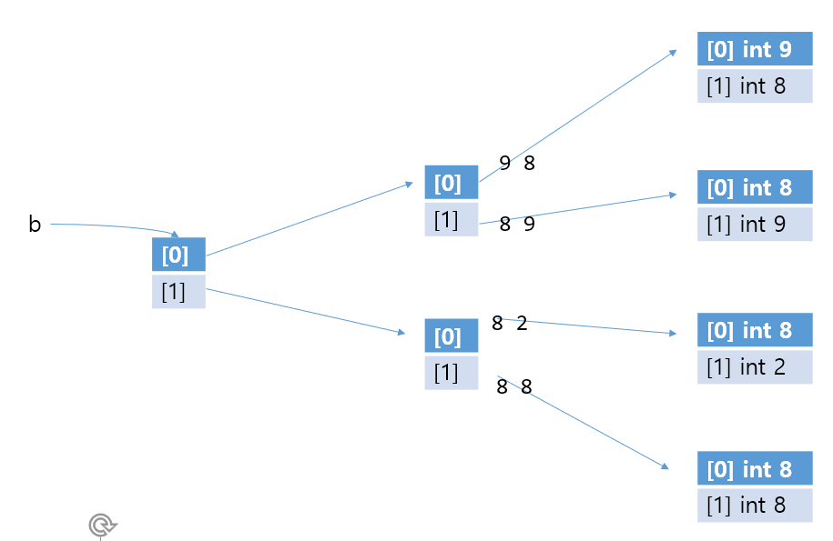 b[0][0]은 b[0]에서 첫 번째 요소인 int[ ] 타입의 배열이다.