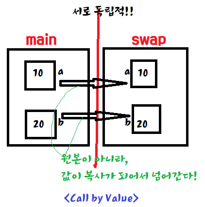 main에서의 a, b는 swap에서의 a, b와 전혀 관련이 없기 때문에(독립적)