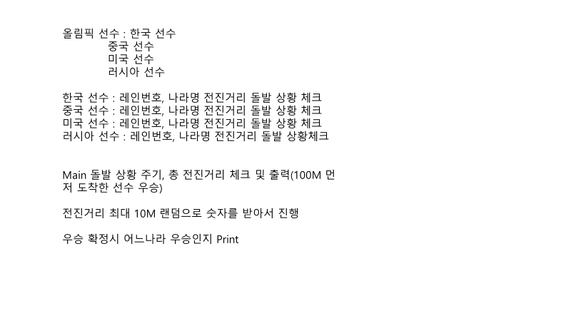 - 선수 클래스를 하나 만들고, 객체를 네 개 만들어서 레인번호 / 국적으로 차별화