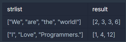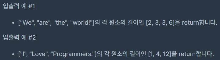문자열 배열 strlist가 매개변수로 주어집니다. strlist 각 원소의 길이를 담은 배열을 retrun하도록 함수를 완성해주세요.