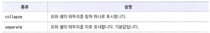 - 표 테두리는 border 속성을 사용하는데 표 바깥 테두리와 셀 테두리를 각각 지정한다.