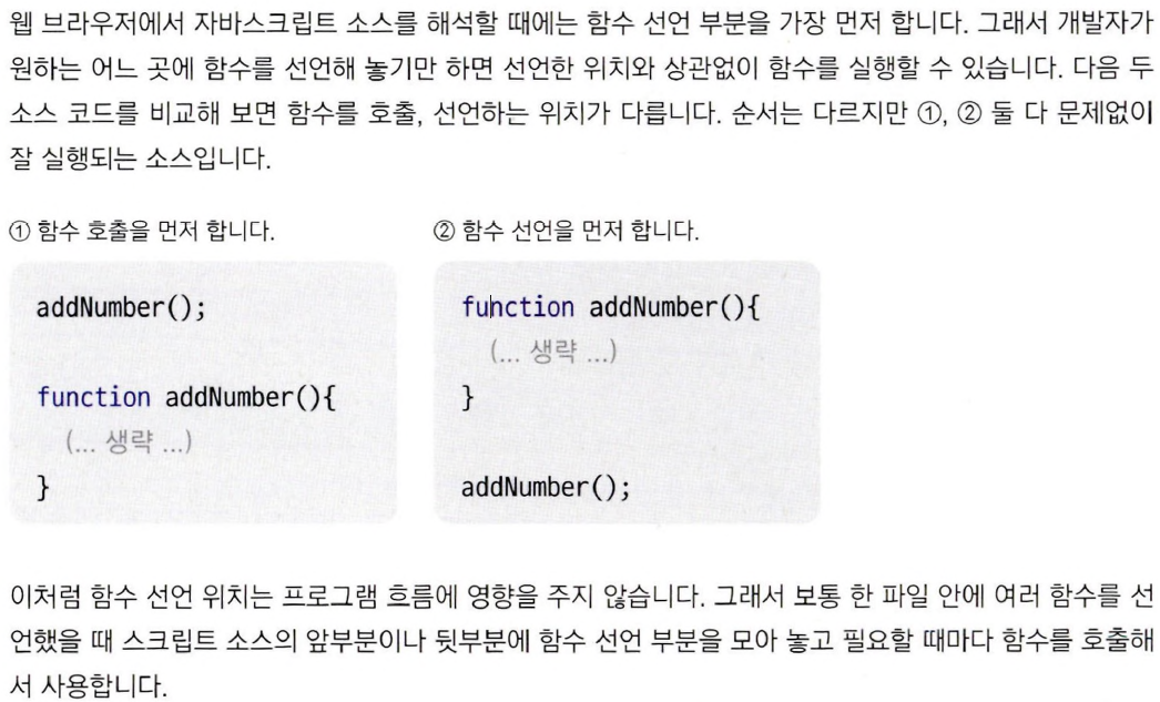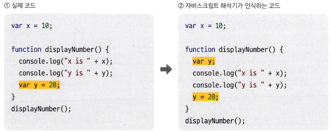 - 변수를 실행하기 전이지만 ‘이런 변수가 있구나’ 하고 기억해 두기 때문에 마치 선언한 것과 같은 효과가 있는 것.
