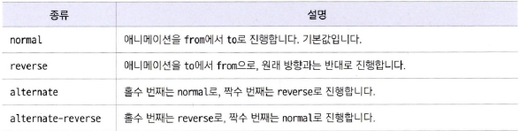 - 기본적으로 keyframes 에서 정의한 from->to 순서로 움직임