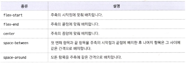 - 주축에서 플렉스 항목 간의 정렬 방법을 지정