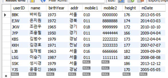 SELECT distinct addr From usertbl order by addr; -- 중복제거, 주소 있는 사람만 나옴.
