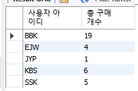 SELECT userID AS '사용자 아이디' , sum(amount) AS '총 구매 개수' from buytbl GROUP BY userID;
