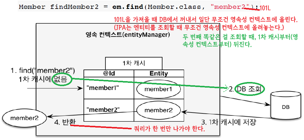 => 내가 자바 컬렉션에서 가져왔을 때 주소가 동일했던 것처럼, JPA가 == 비교를 보장해준다는 뜻. (1차 캐시 덕분)