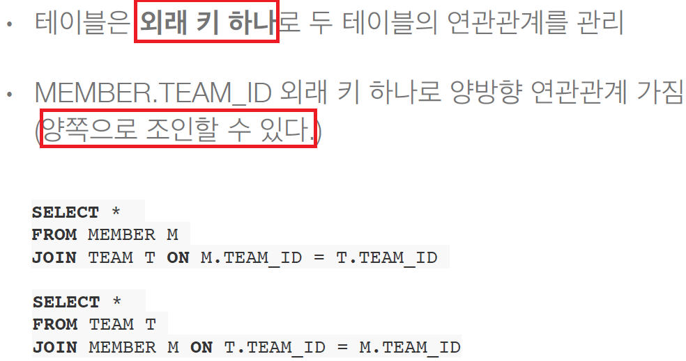 => 테이블의 연관관계는 FK 하나로 양방향이 다 있는 것.