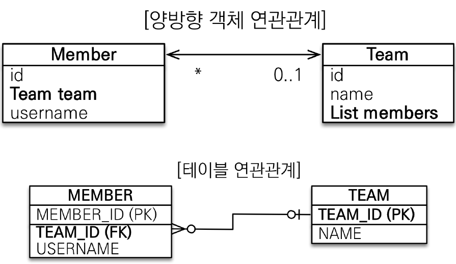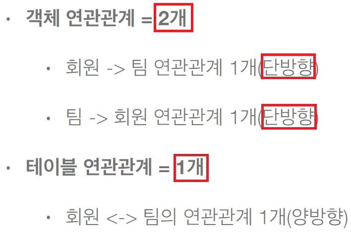 • 객체의 양방향 관계는 사실 양방향 관계가 아니라 서로 다른 단뱡향 관계 2개다.