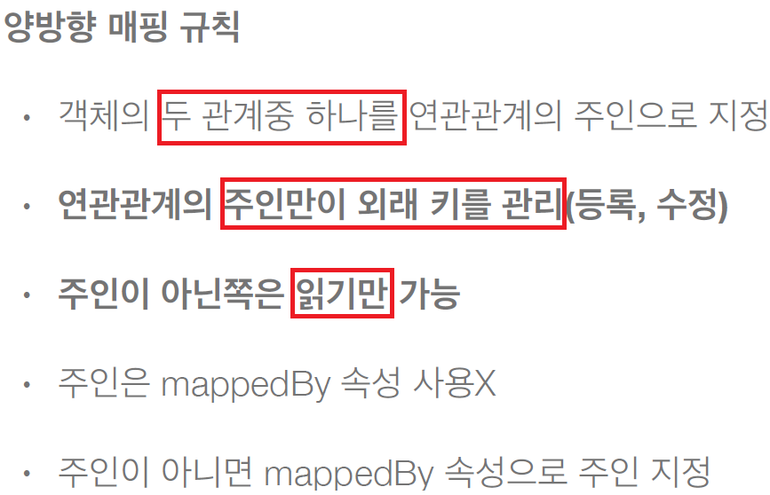 • 양방향 매핑은 반대 방향으로 조회(객체 그래프 탐색) 기능이 추가된 것 뿐