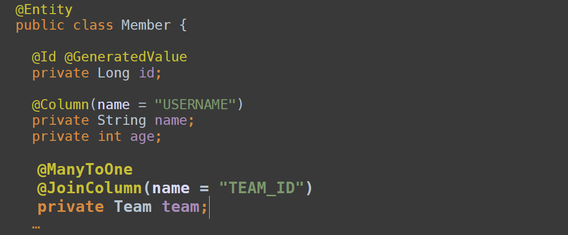 // 그리고 객체에 있는 Team team;레퍼런스랑. Member 테이블의 TEAM_ID(FK)랑 매핑을 해야.