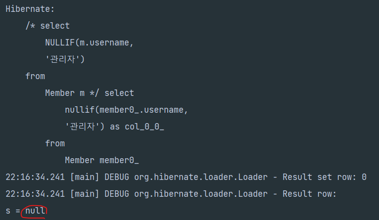 String query = "select NULLIF(m.username, '관리자') from Member m";