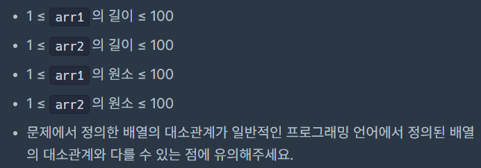 두 정수 배열 arr1과 arr2가 주어질 때, 위에서 정의한 배열의 대소관계에 대하여
