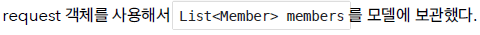 - request.setAttribute("members", members)를 사용하여 "members"라는 이름으로 회원 목록을 Model에 저장한다.