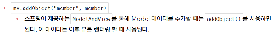 - addObject 메서드를 사용하여 ModelAndView에 "member"라는 이름으로 회원 객체를 추가함.