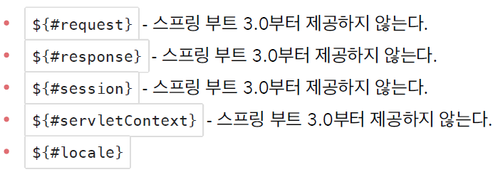 스프링 부트 3.0 부터는 ${#request} , ${#response} , ${#session} , ${#servletContext} 를 지원하지 않는다.