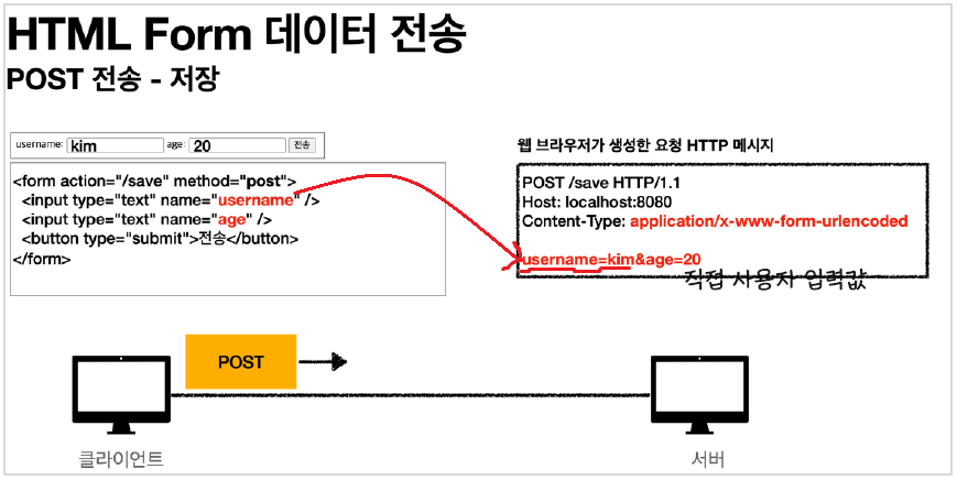 - 그리고 폼에 입력한 전송할 항목을 HTTP Body에 문자로 username=kim&age=20 와 같이 & 로 구분해서