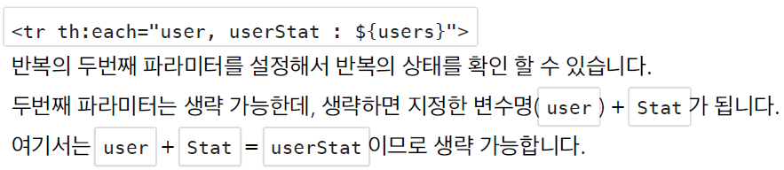 - th:each="user, userStat : ${users}"를 사용하여 사용자 목록을 반복하면서 userStat 변수에 반복 상태 정보를 저장.