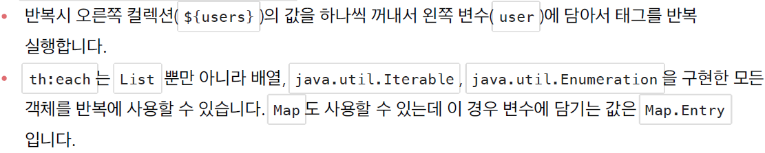 - th:each 속성을 사용하여 ${users} 변수의 각 사용자에 대해 반복하고,