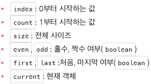 - 반복 상태 정보는 index, count, size, even, odd, first, last, current 등 다양한 속성으로 사용자 정의할 수 있으며,
