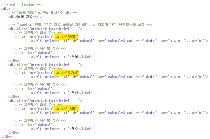 - 이 부분은 체크박스를 생성하는 부분입니다. th:field 속성은 Thymeleaf의 폼 바인딩을 사용하며, *{regions}는 해당 체크박스의 값을 연결할 모델 속성을 나타낸다.