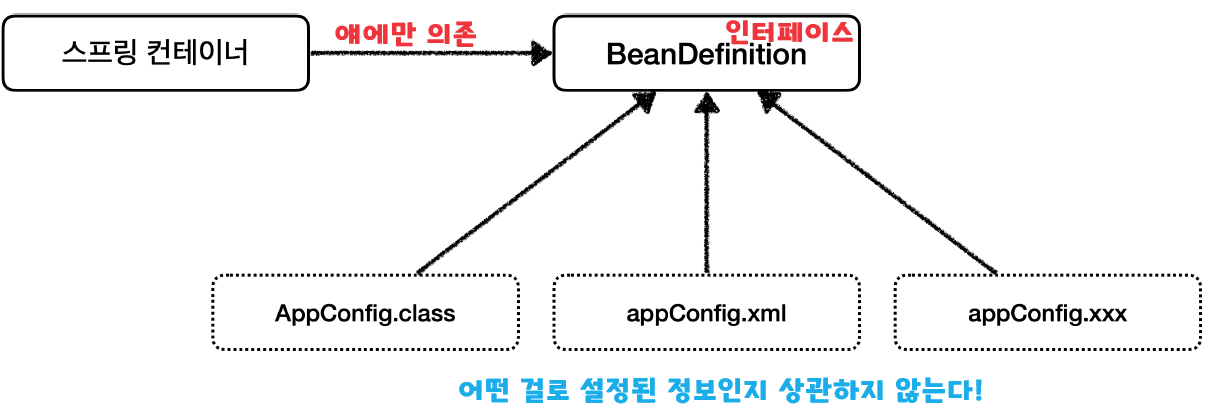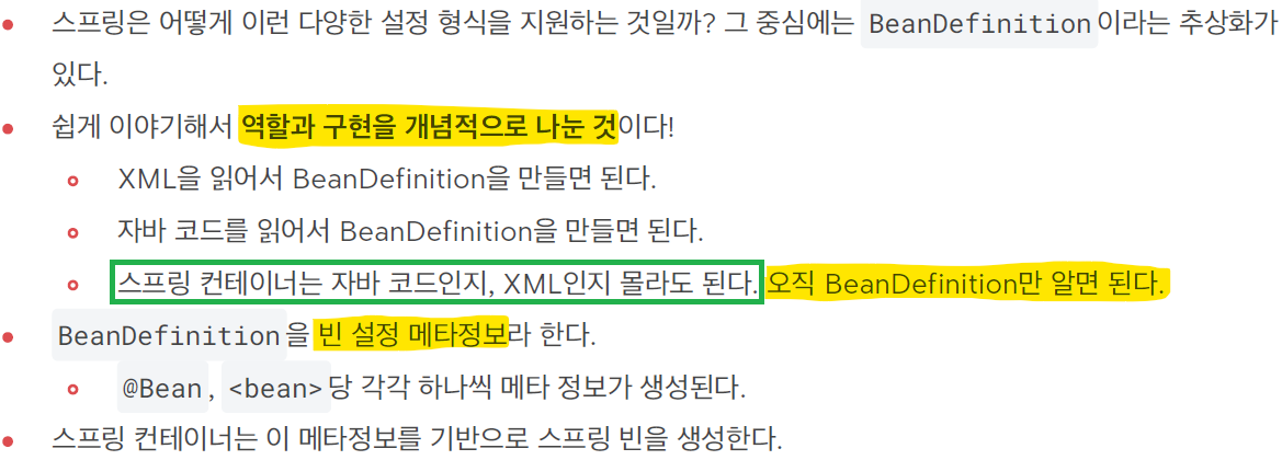 - BeanDefinition에 대해서는 너무 깊이있게 이해하기보다는, 스프링이 다양한 형태의 설정 정보를 BeanDefinition으로 추상화해서 사용하는 것 정도만 이해하면 된다.