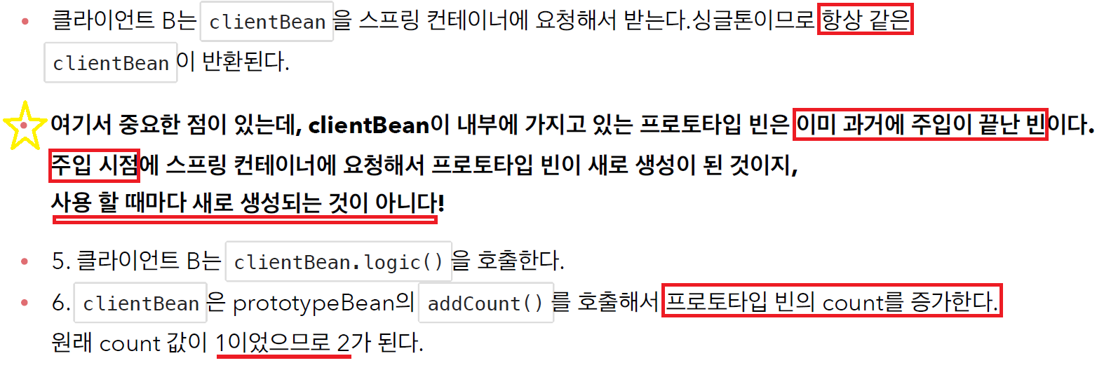 스프링은 일반적으로 싱글톤 빈을 사용하므로, 싱글톤 빈이 프로토타입 빈을 사용하게 된다.